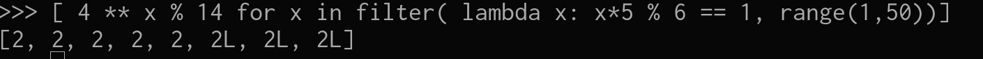 So I’ve made a list of numbers from 1 to 50 and , filtered the ones that when multiplied by E and moduled by LNCF(N) are equals 1 , so let’s see if those can decrypt the message :) , Remember the encrypted message is “4”,and the decrypted message is “2” so the function should be something like: